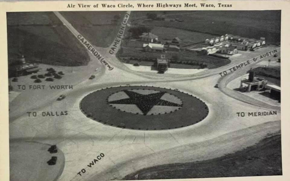 The Waco Traffic Circle was built in 1933, and highways connected to it in 1934 and 1935. The date of this photo is unknown. The Elite Café, not shown, was built in 1941. When the Circle was first built, it was “out in the country”. Wacoans could drive out S. 18th Street to Circle Road and then drive around the Circle and drive back to town. No highways were connected to it yet. But in 1934 and 1935, all the major highways around Waco were connected it, and it became the traffic hub of Waco. We’ve been “surviving the Circle” for almost 88 years!
