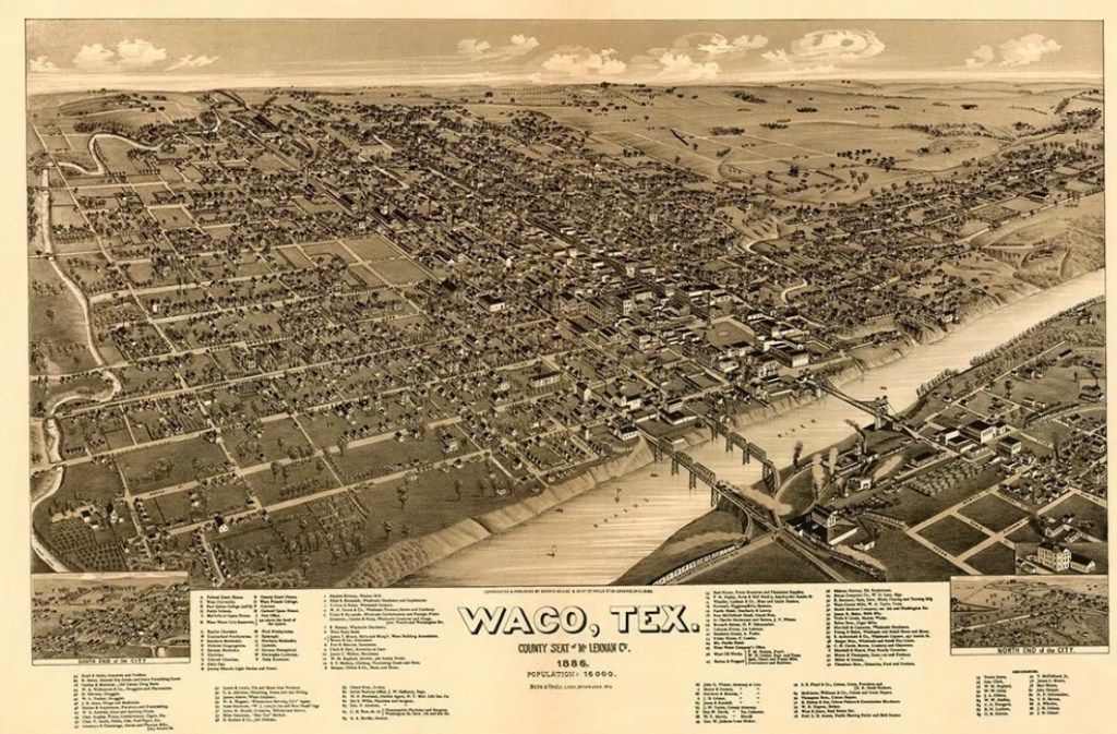 In 1886, Waco had officially been a town for 37 years. The population was 16,000. The Suspension Bridge was sixteen years old, the Washington Avenue Bridge was 16 years in the future, and the Amicable Building was 25 years in the future. Trees grew along the rivers, but all the surrounding area was mostly treeless prairie land. In this artist’s/balloonist’s view, we can see the vast, open prairie that was North Waco. It still looked much like this when Camp MacArthur was built in 1916. Many things have changed…but the old Brazos De Dios…the Arms of God, was rolling along and wrapping around our city…just as it does today!