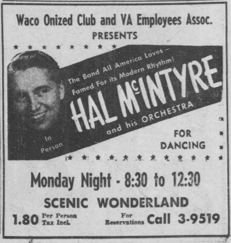 We are not sure when it was built, but Scenic Wonderland was a popular nightclub and entertainment venue in the early 1950s. It was out LaSalle Avenue, across the Brazos River at the Marlin Highway. It was built by the Gorham Brothers-Tracy, John and Mack. Our group member Deborah Gorham is the daughter of Tracy Gorham. They sold it to Judson Baker, and he sold it to Cecil Epps, who owned several other clubs in Waco. Group member Paula Owen is Cecil Epps’ daughter. Scenic Wonderland was billed as “The Largest Nightclub West of the Mississippi” and hosted popular bands and entertainers of the day…comedians, magicians, and big-name bands including Bob Wills and the Texas Playboys, Tommy Dorsey, Charlie Spivak, Gene Krupa, and Hal McIntire. Local musicians and bands like Doodle Owens and Omar McKim also played there. In later years, Scenic Wonderland hosted wrestling matches. The Scenic Wonderland exploded burned on Tuesday, October 4, 1955.