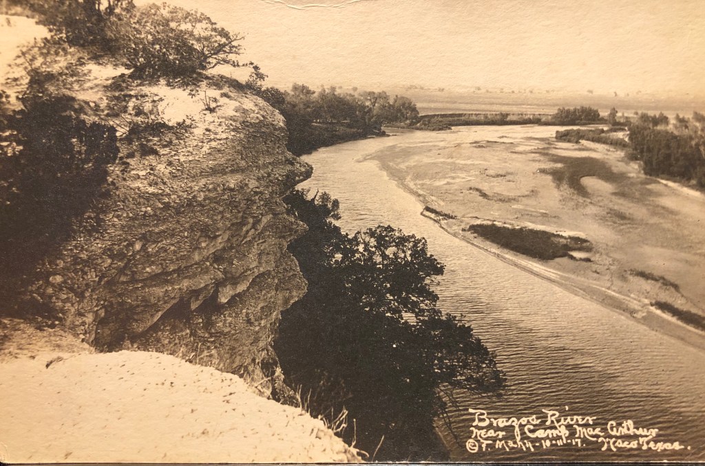We recently acquired this post card photo that I had never seen. It was taken by T. Mann, a photographer who seems to have been associated with WWI Camp MacArthur (1917-19) in North Waco. The cliff is what we now know as “Circle Point” and the Bosque River, which has just flowed past Lovers Leap, is now joining the Brazos River, where it will continue the journey south through Waco and beyond. Where the Bosque River meets the Brazos River is called the “Mouth of the Bosque”. The area at the top of the photo is Steinbeck Bend. And if you’re new to Waco, “Bosque” is pronounced “Bos-Kee”. 😊