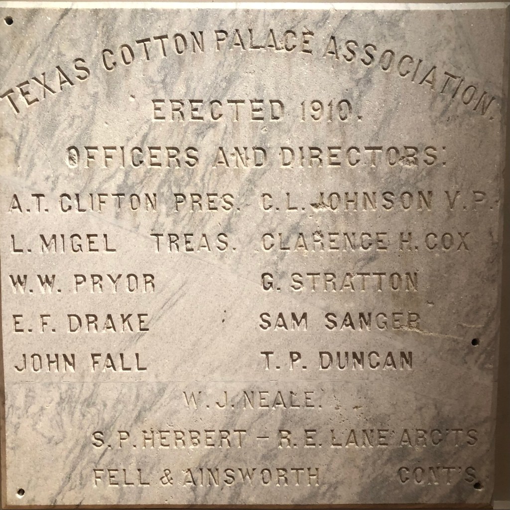 This cornerstone is a part of the Texas Cotton Palace collection at the Helen Marie Taylor Museum.