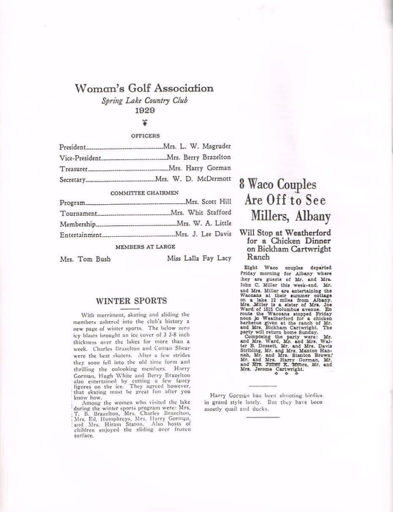 Although Spring Lake Country Club existed for only a few years, the glowing memories of the happy times there are bright within those who knew it. The club was located on 125 acres of rolling hills, trees and lakes just north of town and was considered to be the most beautiful country club site in Texas. From 1903 to 1917, the area was owned by Mr. and Mrs. A.H. Day and was a recreational area known as Day’s Spring Lake. Newspaper accounts from that time recall it as a favorite Fourth of July spot for Wacoans escaping the city’s heat where political orations, lemonade, swimming, boating and fishing brought people by buggy, surry, and horseback.