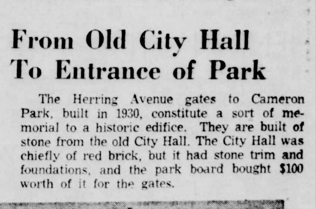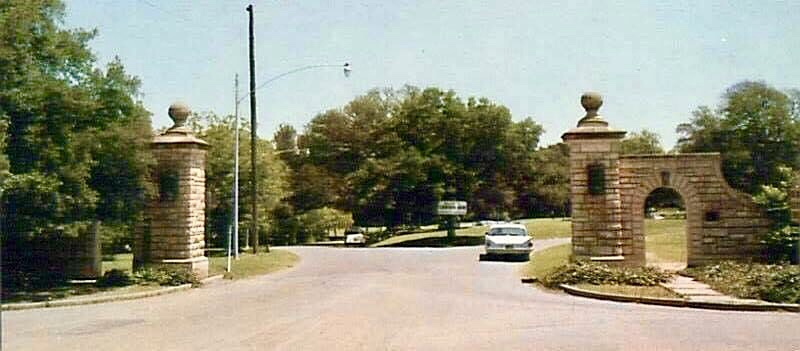 These gates were built in the 1930s from stone that was a part of the old City Hall that was on the Square until it was demolished in 1930. In 1971, Herring Avenue Bridge was completed, and this scene was gone forever.
