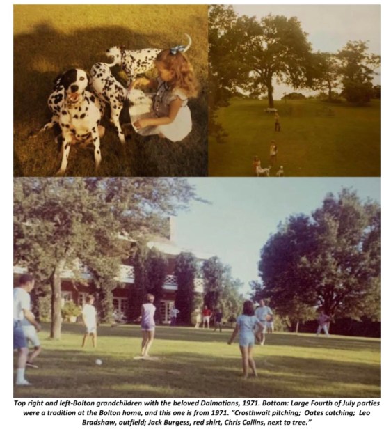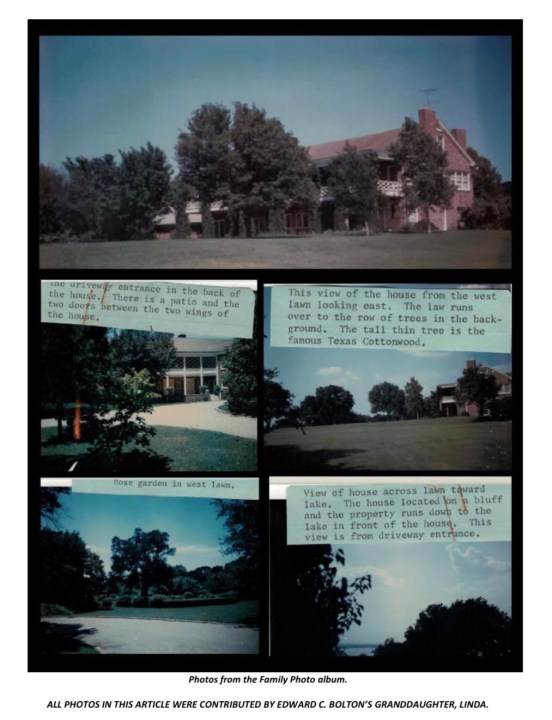 Prior to building his Lake Waco home, Mr. Bolton and his family lived in their ancestral home at 1223 Austin Avenue, from where he also ran his office. The Boltons built their home at Lake Waco around 1946. Their 47-acre property had a two –story red brick home that overlooked Lake Waco, and featured a beautiful lawn and large rose garden. The driveway looped around to the back of the house, where there was a main entrance. They loved dogs, and had several Dalmatians. Mr. Bolton facetiously called his place “Poverty Hill” when he complained to the builder about the cost of its construction.