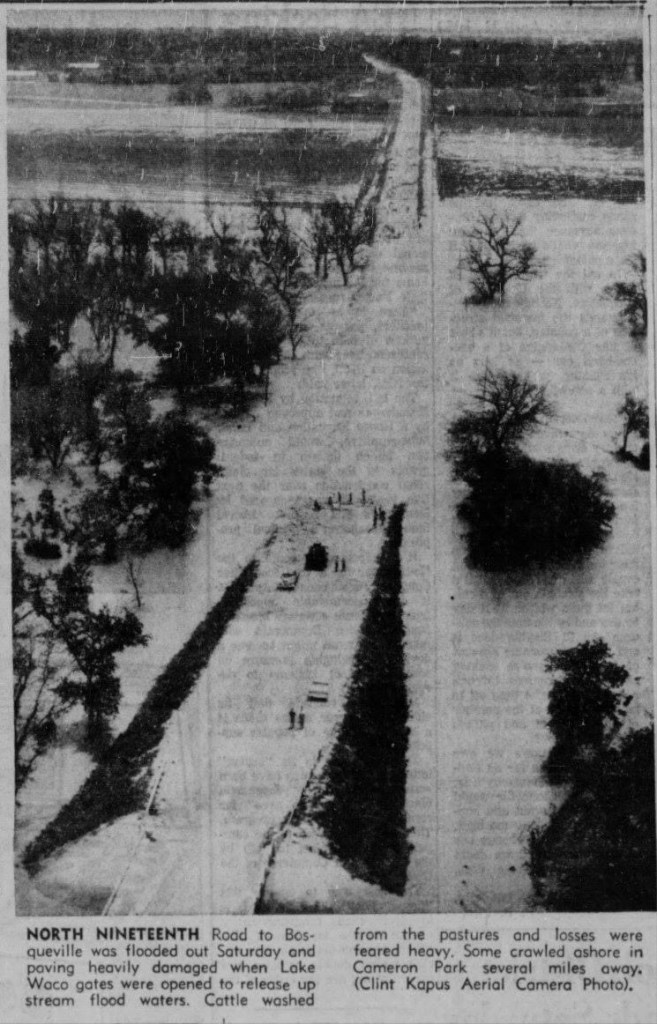 The Waco News Tribune, April 21, 1957. Due to heavy flooding, water had to be released from the OLD Lake Waco Dam. It flooded the road between Bosqueville and Waco, and this photo description says that many cows were washed away, some washing up in Cameron Park!