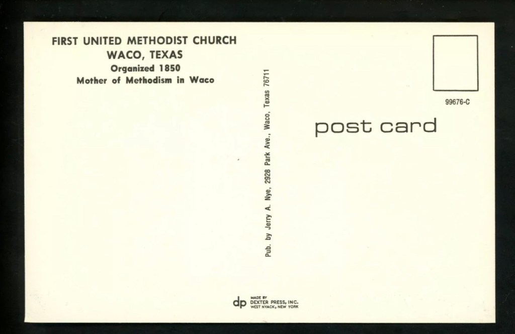 Waco’s First United Methodist (organized 1850), 4901 Cobbs Avenue. This was the original sanctuary when the church moved from the downtown location. Postcard image from eBay.