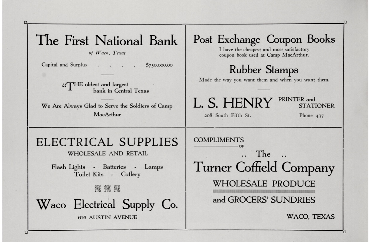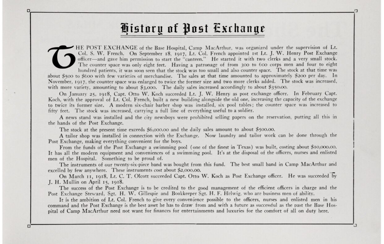 It is the ambition of Lt. Col. French to give every convenience possible to the officers, nurses, and enlisted men in his command and the Post Exchange is the best asset he has to draw from and with a future as successful as the past the Base Hospital of Camp MacArthur need not want for finances for entertainments and luxuries for the comfort of all on duty here.