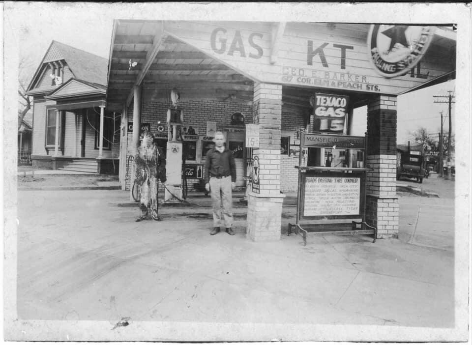 , who said: “George Barker’s Texaco Station on the corner of Elm and Peach in East Waco, c.1920s. My Dad, Dollin Jenkins under the canopy with some unidentified gentleman whose image has been obliterated. This would have been on the Gulf branch of the Meridian Highway