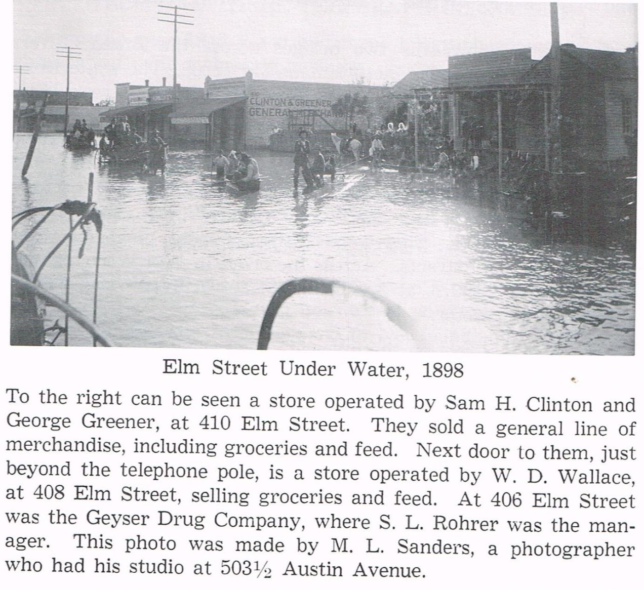 img_7076 Elm Street Under Water, 1898. There is an amazing description under the photo. From the book “A History of Early Waco With Allusions to Six Shooter Junction” (1968) by William H. Curry. Like Loading...
