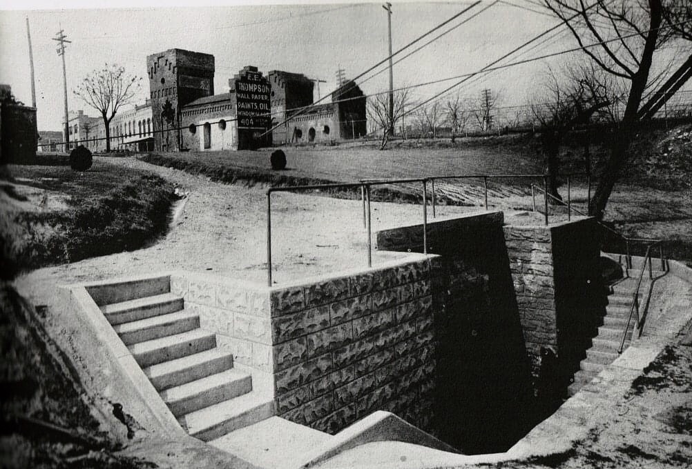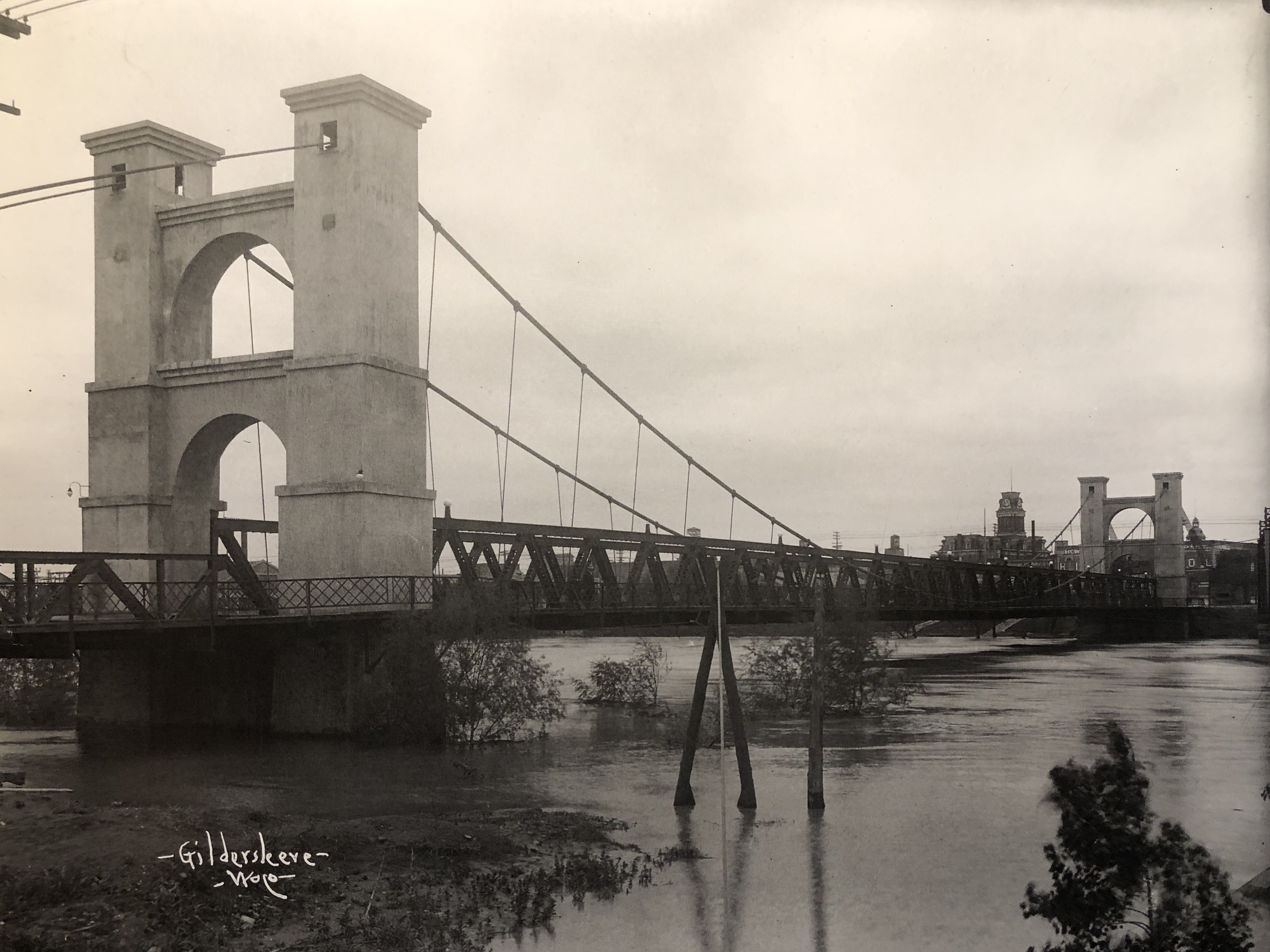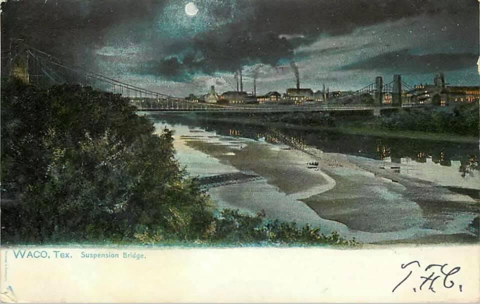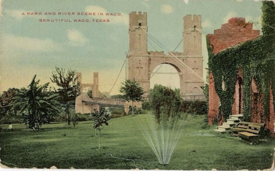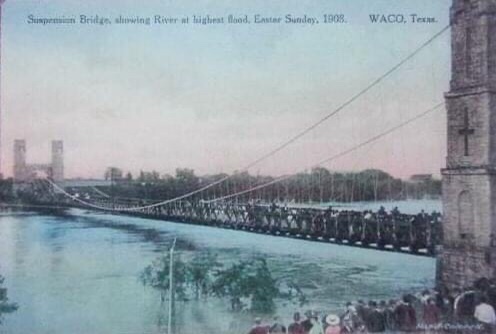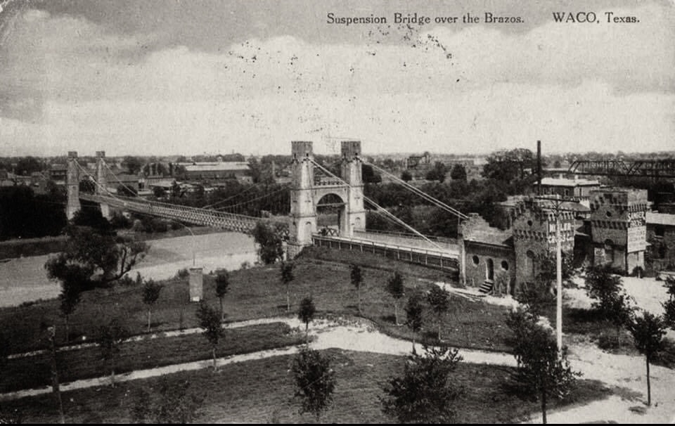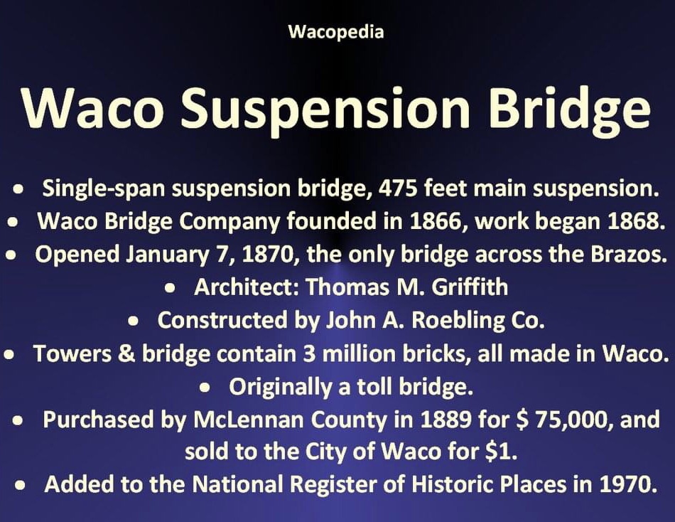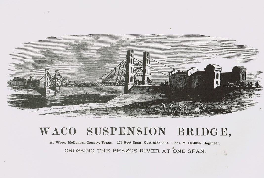 The Waco Suspension Bridge was the first bridge to cross the Brazos River. The Waco Bridge Company was formed in 1866 and hired architect Thomas M. Griffith to design the bridge. Construction began in 1866. Constructed by John H. Roebling, the main suspension of the single-span Suspension Bridge is 475 feet. The Towers and Bridge contain 3 million bricks, all made in Waco. When it opened on January 7, 1870, it was a toll bridge. It was purchased by McLennan County in 1889 for $75,000 and sold to the city of Waco for $1. It knew pedestrian, cattle, and horse and buggy traffic, then later automobile traffic. It was added to the National Register of Historic Places in 1970, and today the well-loved bridge serves as a pedestrian bridge and tourist attraction.