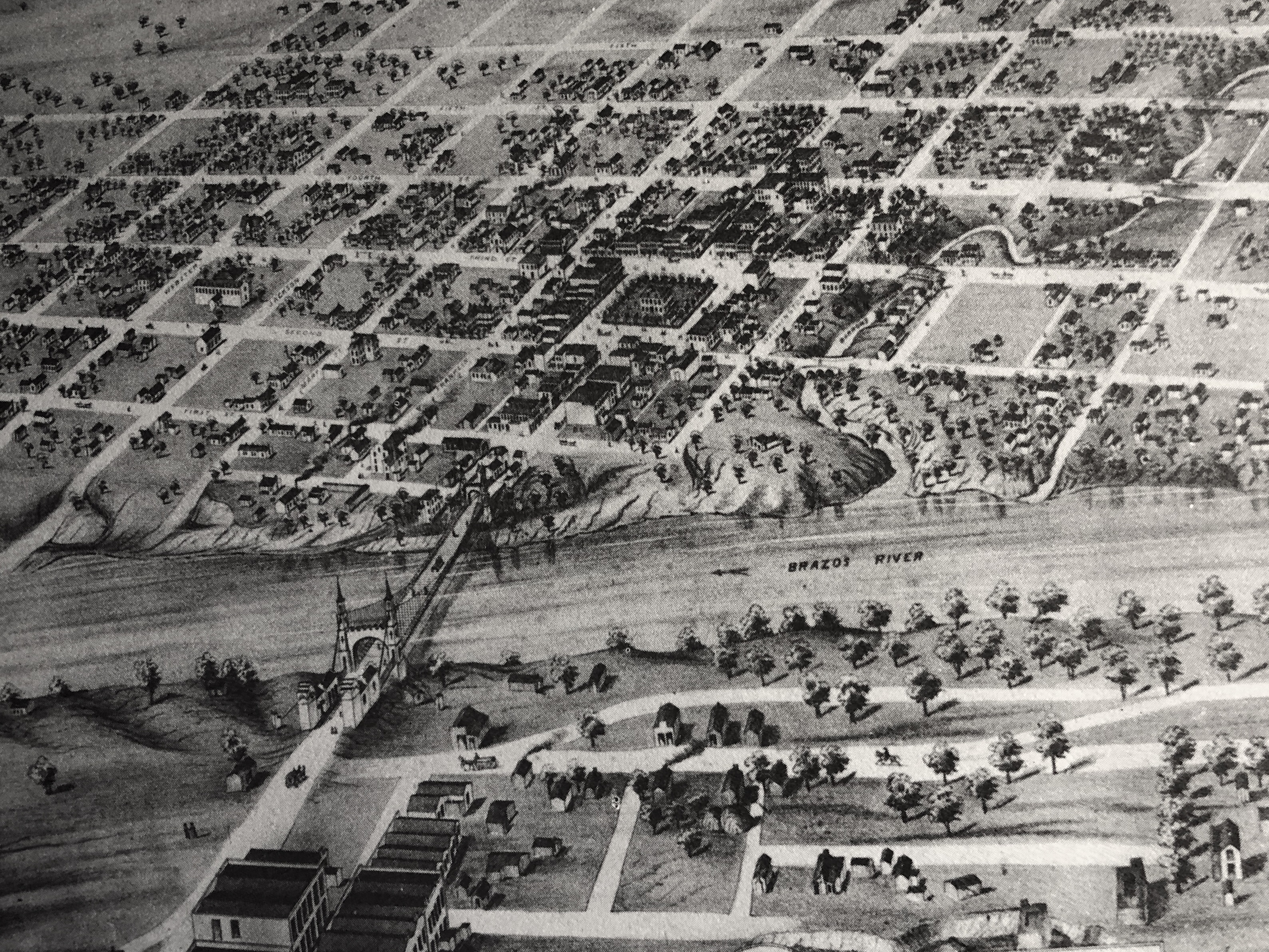Artist or balloonist’s concept of Waco, 1873 showing Bridge