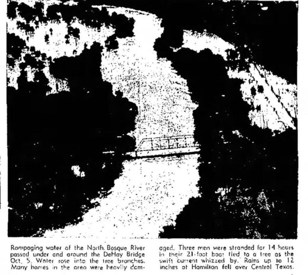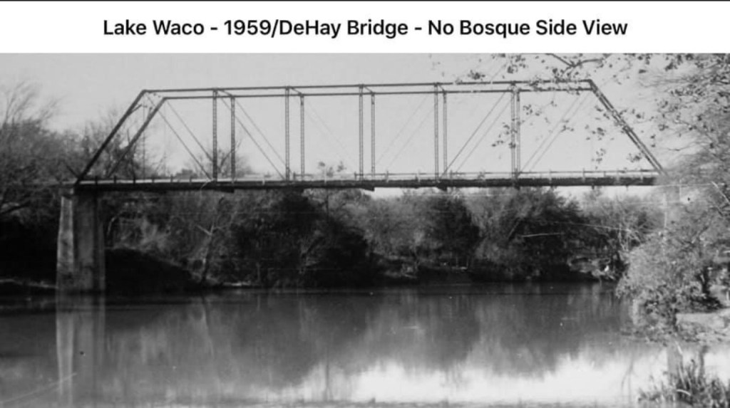 Although it’s gone, and the location is now underwater, the old bridge served Waco and Speegleville for almost 60 years, with its first 30 years at Mills Crossing and its last 30 years at DeHay’s Crossing.