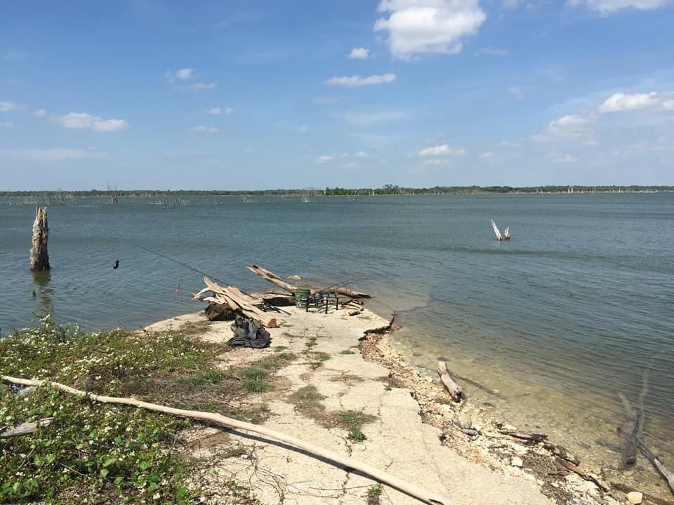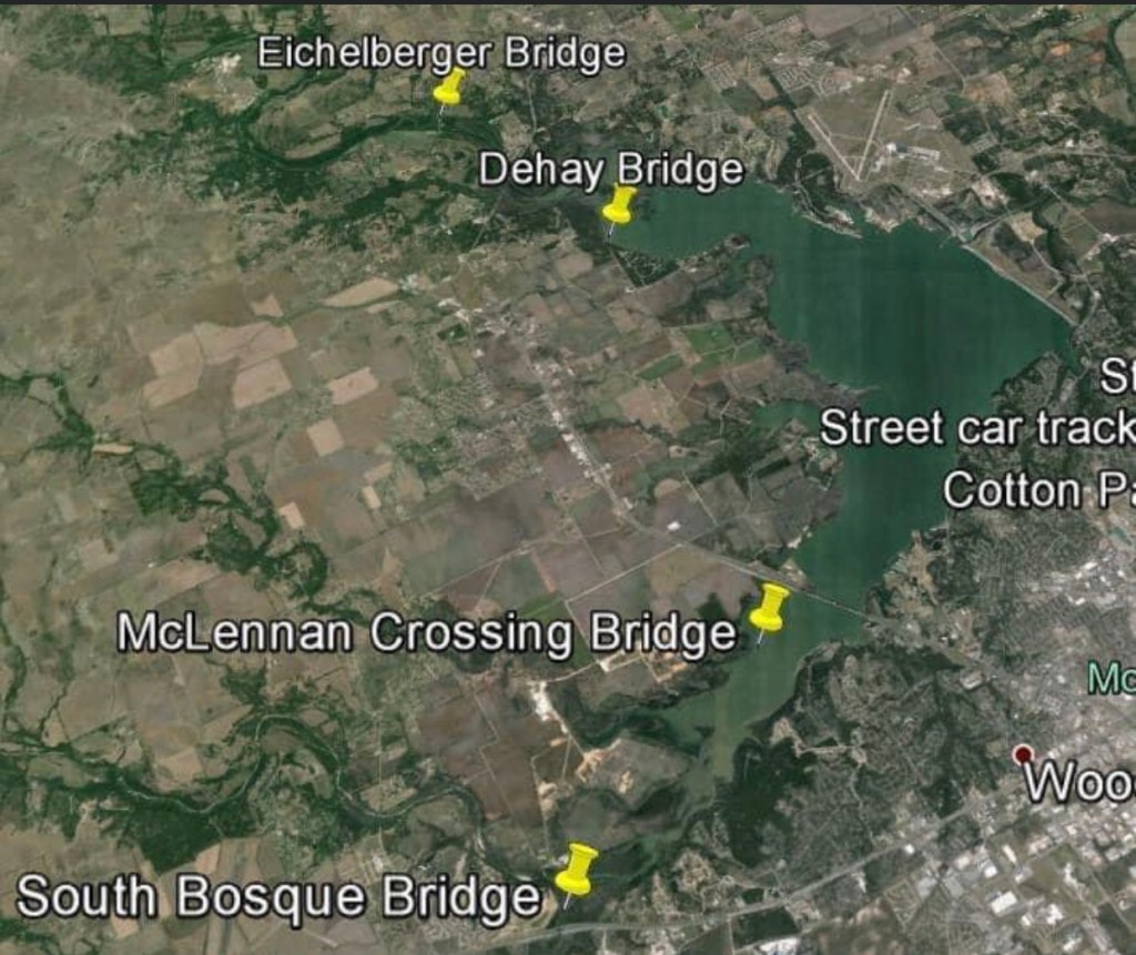 Photo courtesy of Mark Randolph/City of Waco. Photo courtesy of Mark Randolph/City of Waco.The DeHay Bridge over flood waters in 1959. From The Waco News Tribune, December 37, 1959. The photo of the flooding was from earlier in the year. This map contributed by Larry E. Jenkins shows the approximate location of the DeHay Bridge. This 1920 map, drawn before the construction of the first Lake Waco Dam in 1929-30, shows Speegleville Road, and the location of the old Speegleville Bridge at Mills Crossing shown at the left side of the photo, in the middle. This map is from our personal collection. This present-day photo was contributed by Bennett Crow, who said: “Here’s how it looks today. Under water. The road goes out to where the bridge was.”